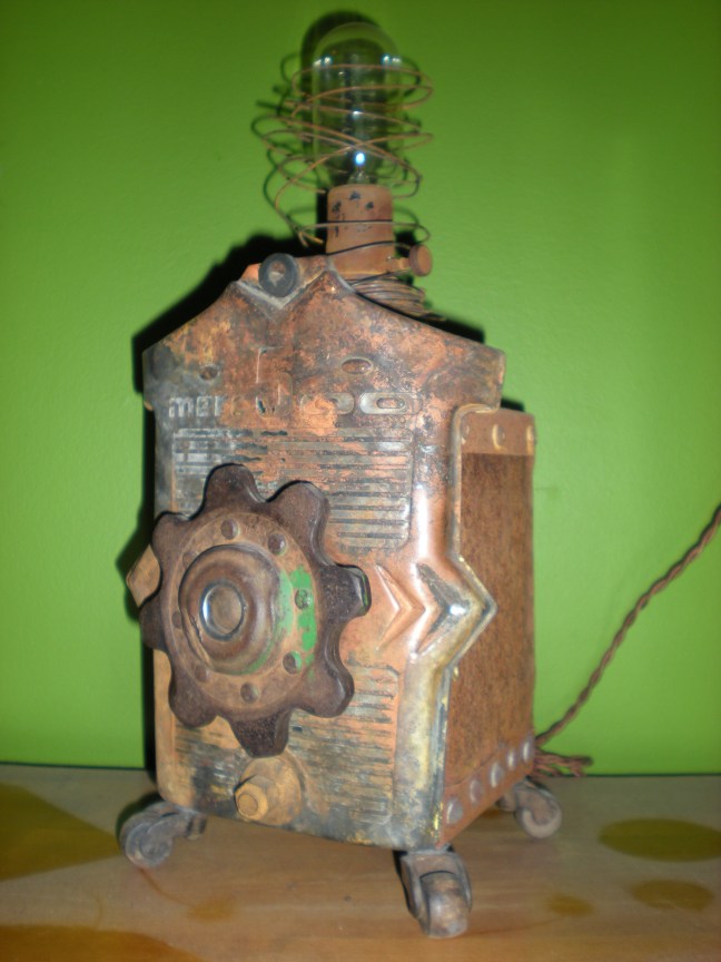 Jeff came in from his studio last night carrying an old doll’s head and a rusty piece of iron welded to four wooden casters and declared, “I’m running out of junk. I need to get more.” The lighting piece in this photo is made from junk, er, found objects, including part of a vintage boat motor Jeff found in the park where we run. One person’s trash is another person’s treasure, and all that. It’s all about perspective.