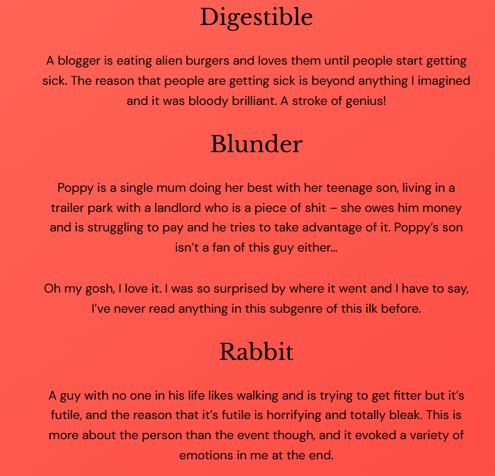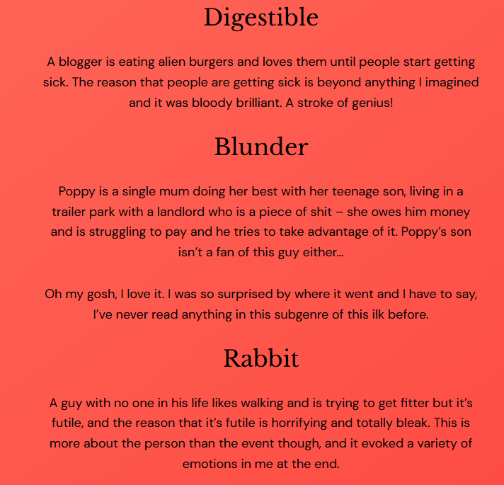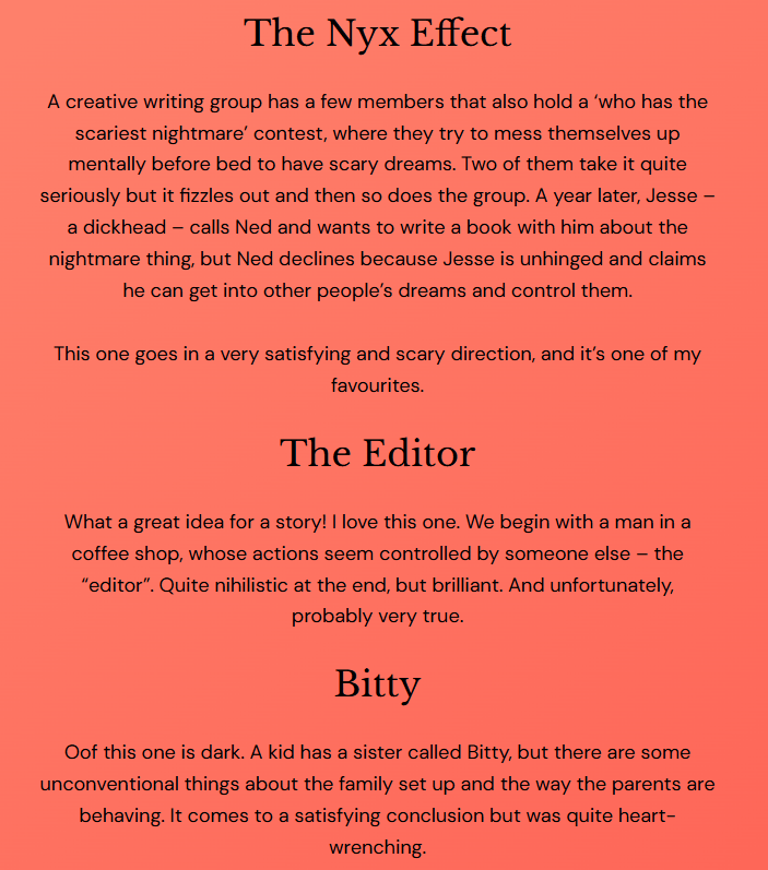 Horror fans, you need this one immediately! The way that Kristin captured me at the start of each tale was incredible. I loved every single one of these stories!