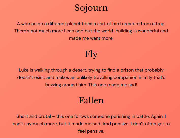 In “Fly,” nature is an instrument of justice and a consoling friend. The protagonist, Luke, is about to serve a prison sentence on a dry, hostile planet. But first he must make a four-day walk to the prison from an undisclosed location with only a protective suit and six liters of water. Once he’s alone on his journey, he realizes that a fly has stowed away in his suit. As his trek progresses through this vast, inhospitable landscape, the relationship between Luke and the fly evolves, making for a surprisingly moving story.