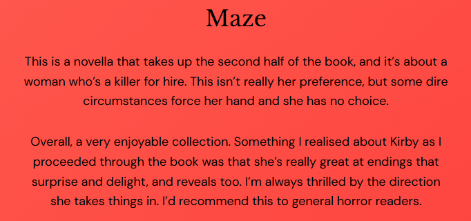Maze isn’t emotionless, but the narration, in the removed third person, makes it more difficult to relate to her feelings. In close third person narration Kirby could have entered her thoughts and drawn from the memories and history that would make her reactions more personal. As the novella stands, what we read is primarily physical description, the kind of thing you’d see on a surveillance camera. With the removed third person, we don’t have direct access to the unique nature of Maze’s despair. Unlike with the characters in the collection’s other stories, we don’t see how her internal life supports or contrasts her external actions.